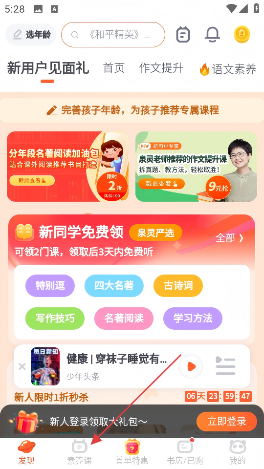 1、在底部导航栏点击【素养课】,进入素养课页面。