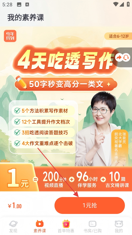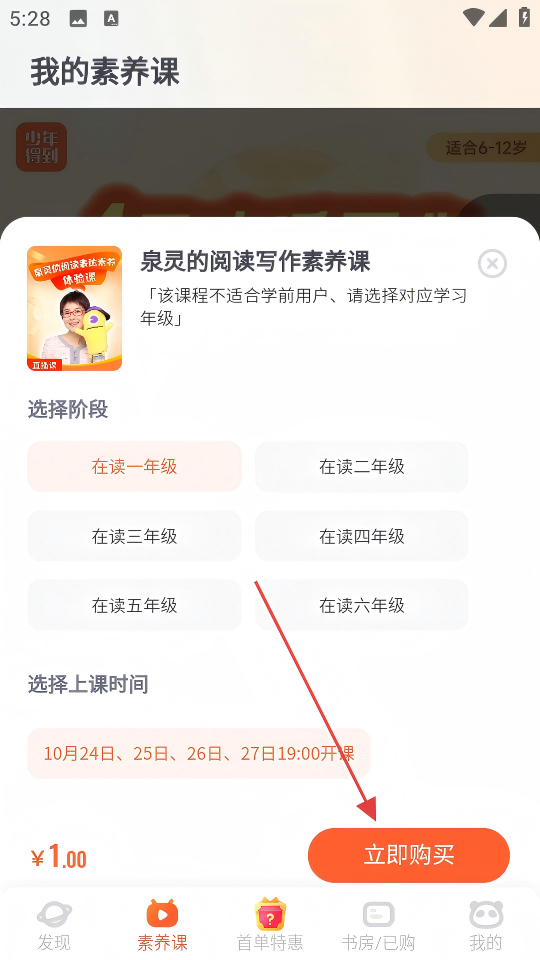 2、在素养课页面找到目标课程,点击【1元抢】进入课程购买选择页面。