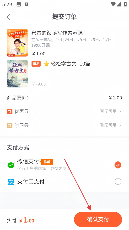 4、在提交订单页面选择支付方式后,点击【确认支付】完成课程购买。
