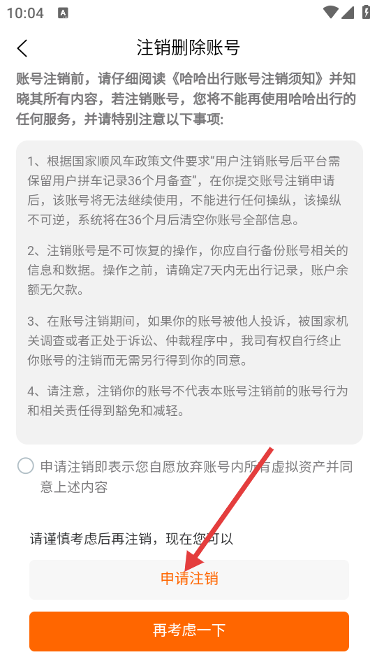 4、在注销删除账号页面,阅读须知后点击【申请注销】按钮完成账号注销操作。
