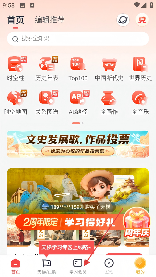 1、在底部导航栏点击【学习会员】,进入学习会员页面。