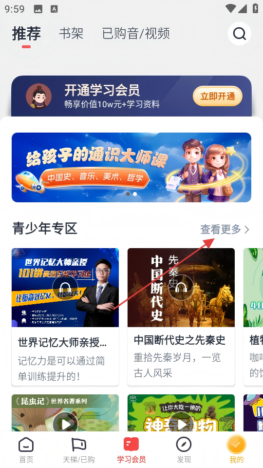 2、在学习会员页面的青少年专区点击【查看更多】,进入音频列表页面。