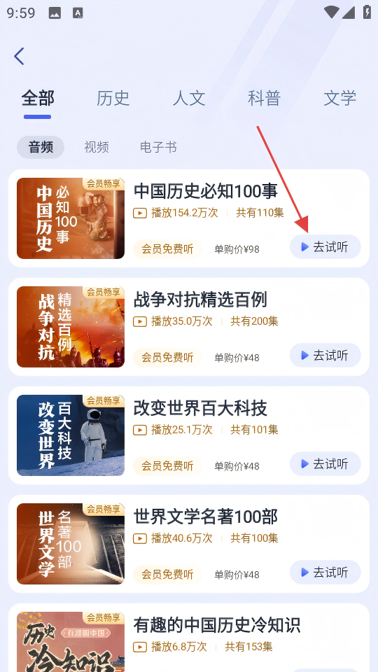 3、在音频列表中找到目标音频,点击【去试听】进入节目详情页面。