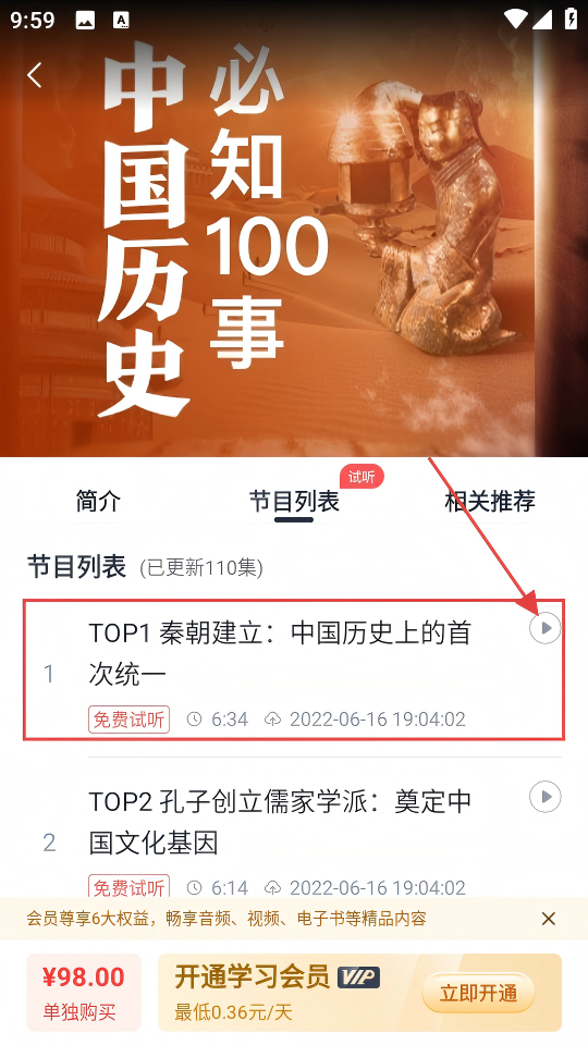 4、在节目详情的节目列表中,点击具体集数的播放按钮,即可开始试听该音频内容。