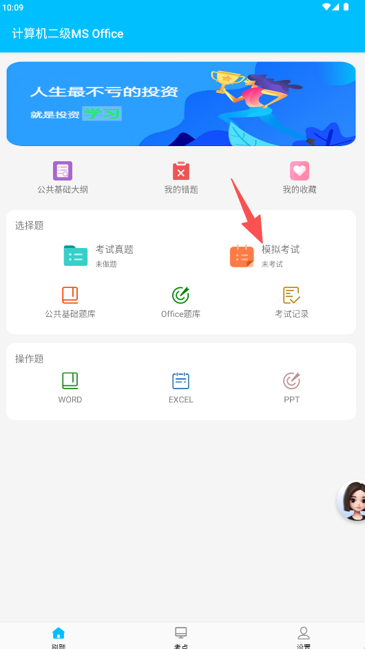 2、题库练习功能,提供考试真题、公共基础题库、Office题库,助力考生全面练习知识点。