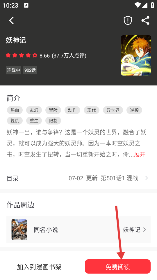 3、在妖神记漫画详情页面中,点击【免费阅读】按钮。