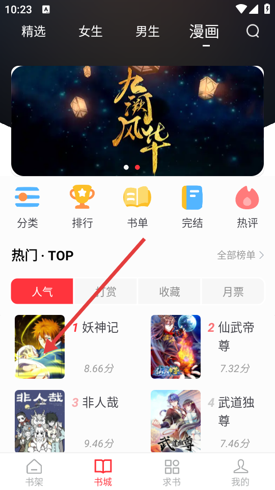 2、在漫画频道的热门列表中,点击【妖神记】漫画。