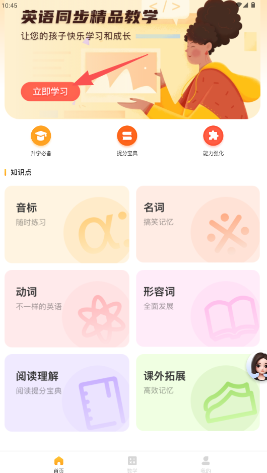 1、知识点学习功能,可学习音标、名词、动词等英语知识点,夯实英语基础。