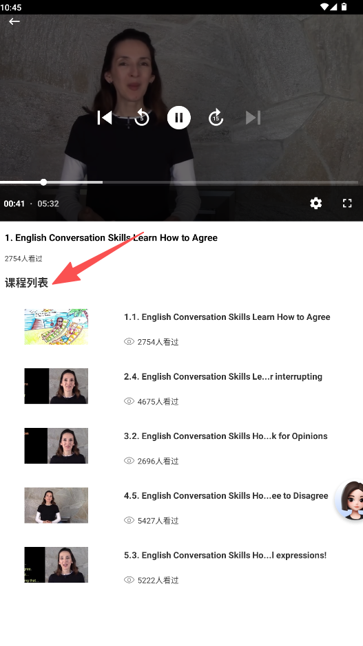 2、查看课程列表,选择英语会话技能等课程进行学习。