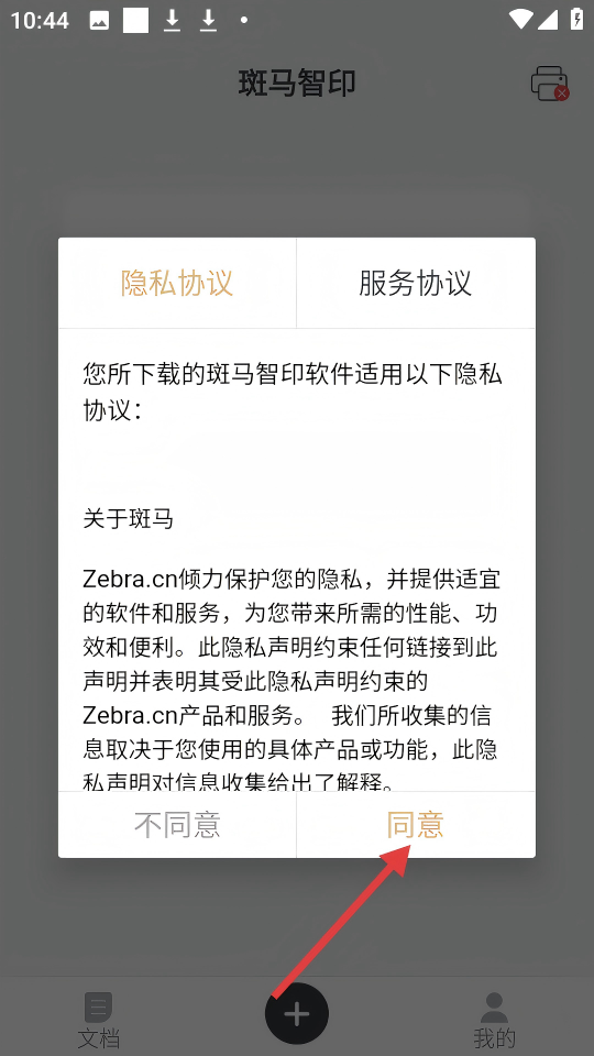 1、在斑马智印的协议弹窗中,点击【同意】,可继续使用应用。