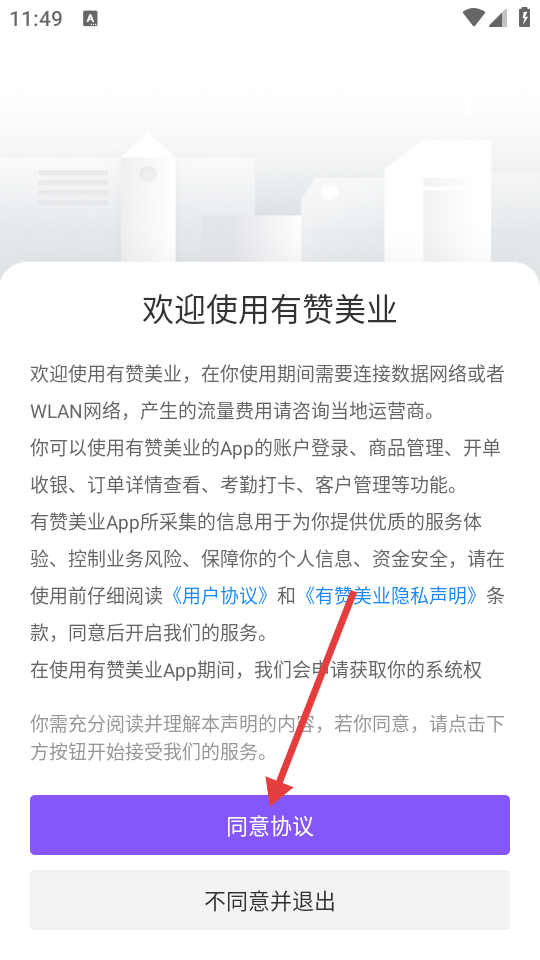 1、在有赞美业的欢迎页面,点击【同意协议】按钮以继续使用软件。