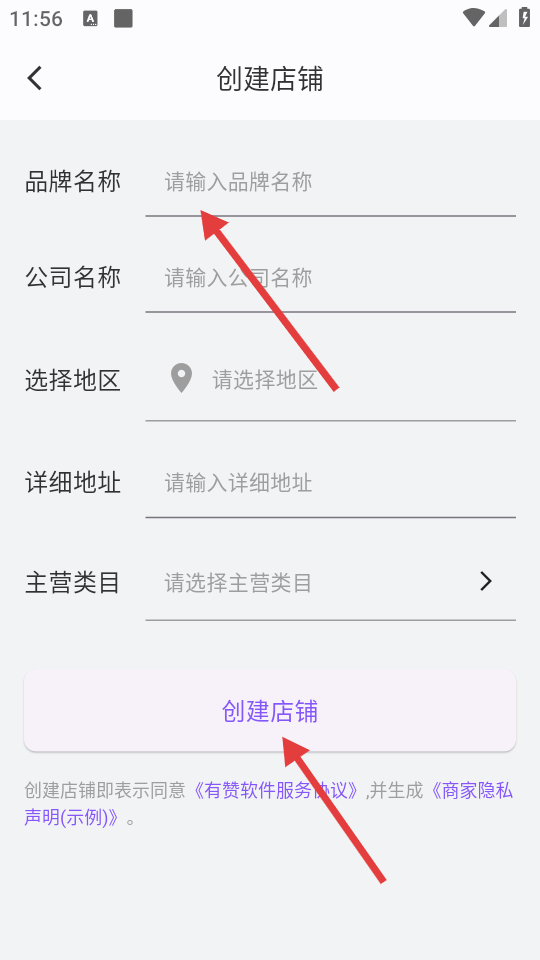 4、在店铺信息填写页面,输入品牌名称、公司名称、选择地区等信息后,点击【创建店铺】按钮完成店铺创建。