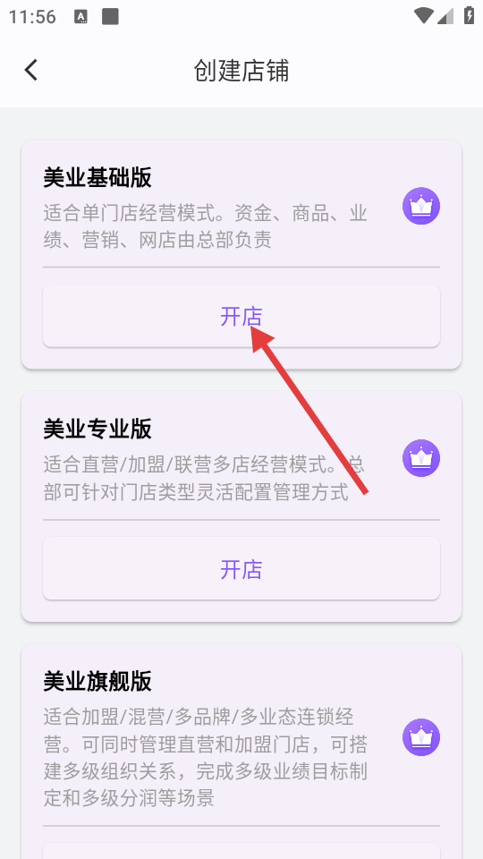 3、在创建店铺页面选择店铺版本,如美业基础版,点击【开店】按钮。