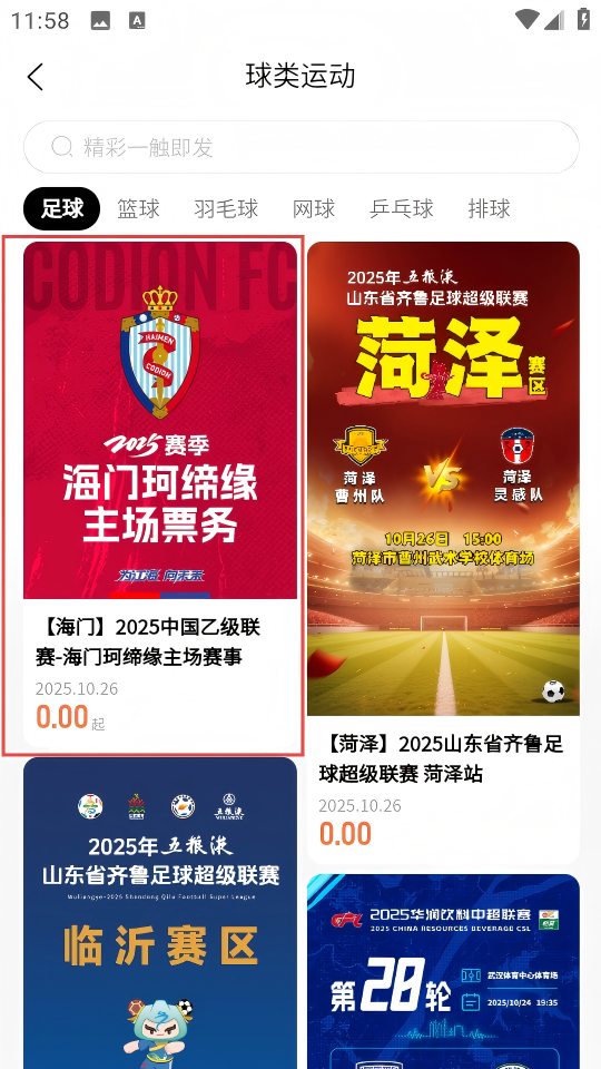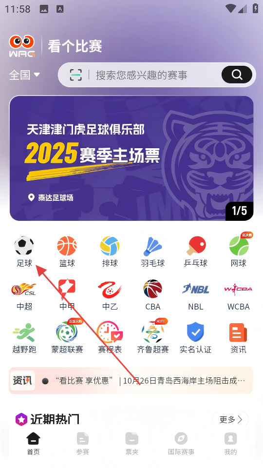1、在首页点击【足球】分类,进入球类运动的足球赛事列表页面。