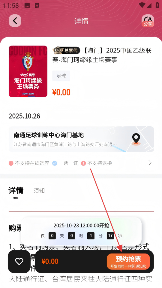 3、在赛事详情页面点击【预约抢票】,进入购票选择页面。