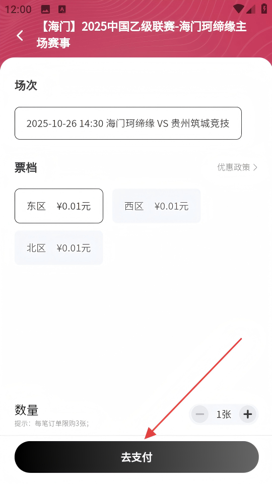 4、在购票选择页面选择场次、票档和数量后,点击【去支付】,完成赛事门票购买流程。