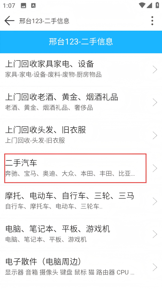3、在二手信息页面点击【二手汽车】,进入二手汽车信息列表页面。