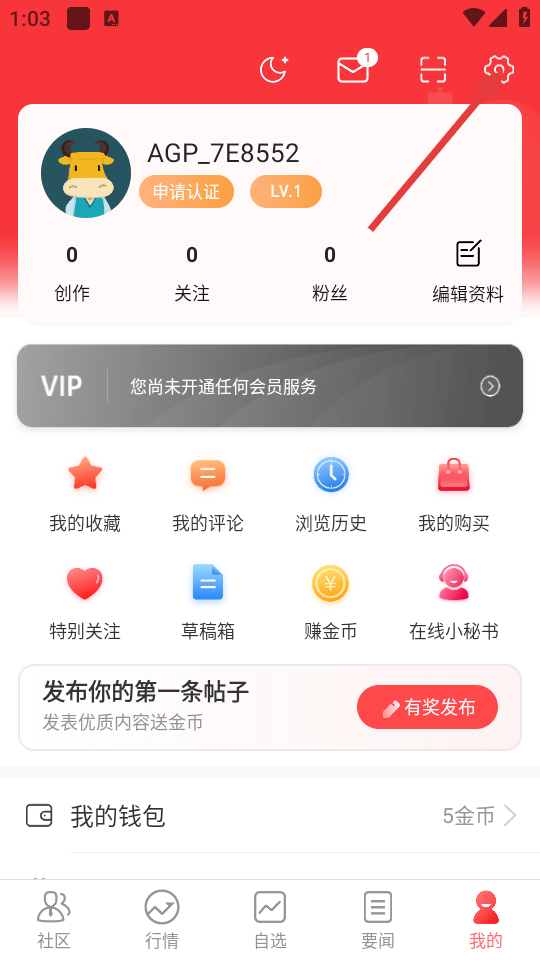 1、在个人页面点击右上角的设置图标,进入系统设置页面。