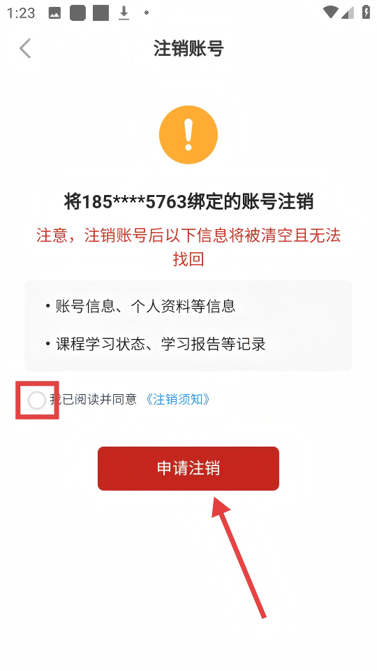 4、在注销账号页面勾选同意《注销须知》后点击【申请注销】可注销账号。