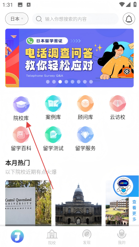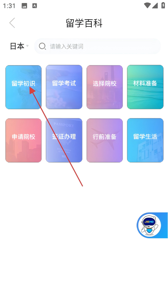 1、在首页点击【留学百科】,进入留学百科页面。