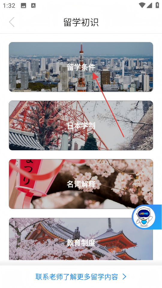 3、在留学初识页面点击【留学条件】,进入留学条件详情页面。