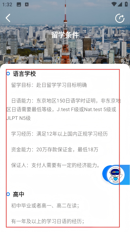 4、在详情页面可查看日本留学中语言学校、高中等不同阶段的具体留学条件。