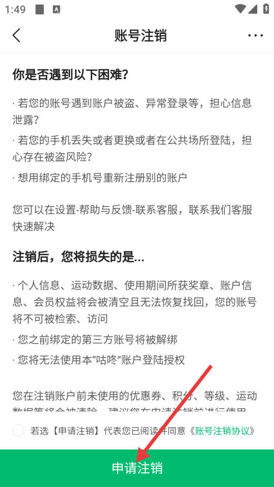 4、在账号注销页面,阅读相关须知后点击【申请注销】按钮完成账号注销操作。