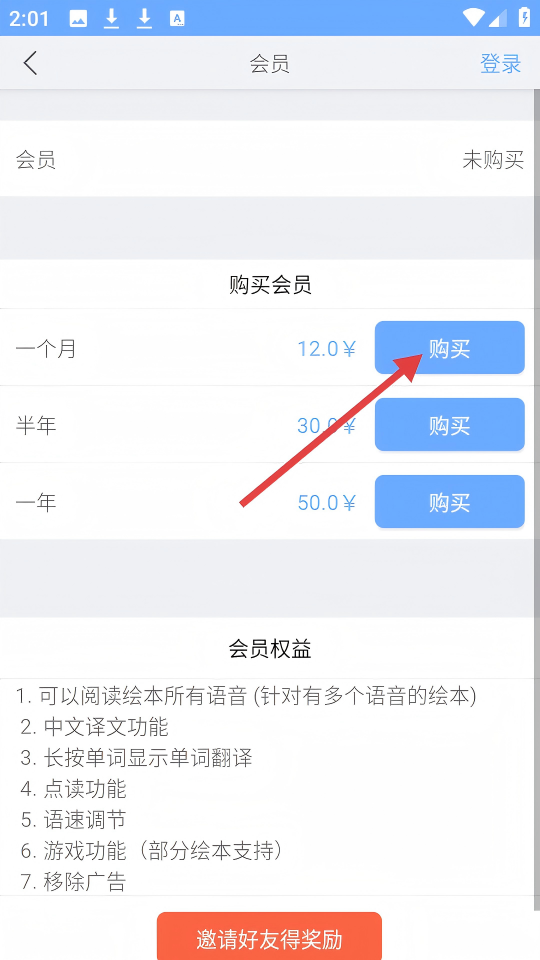 2、在会员页面点击一个月会员对应的【购买】可进入支付页面。