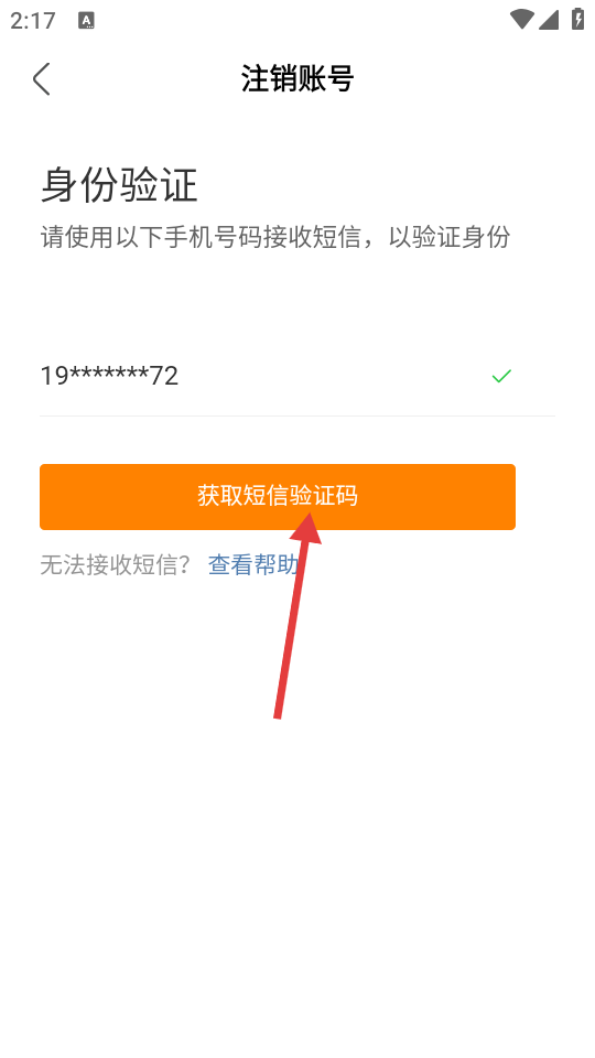 4、在注销账号页面,点击【获取短信验证码】按钮,完成身份验证后,即可继续账号注销操作。