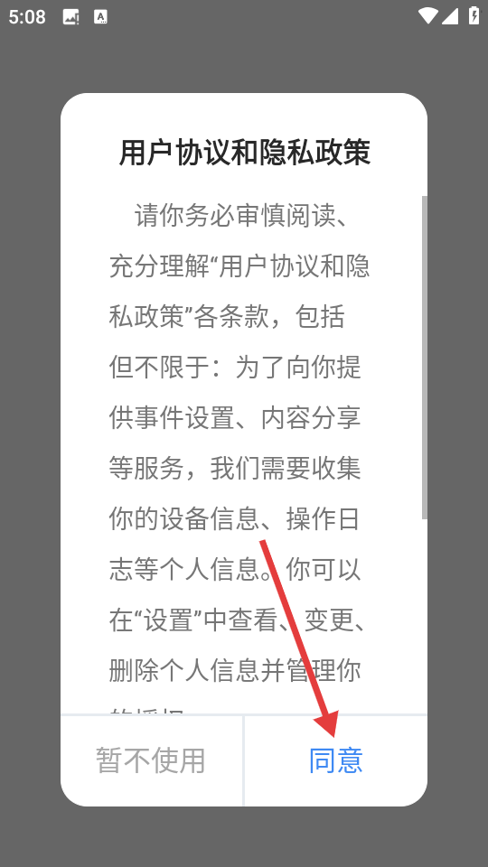 1、在用户协议和隐私政策页面,点击【同意】按钮以继续使用软件。