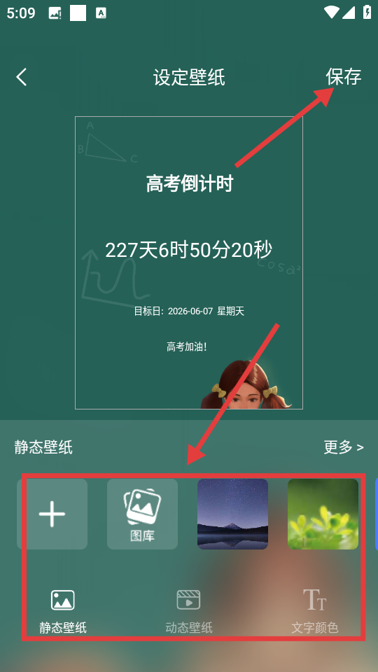 4、在设定壁纸页面,选择静态壁纸、动态壁纸或设置文字颜色后,点击【保存】按钮完成壁纸设定。