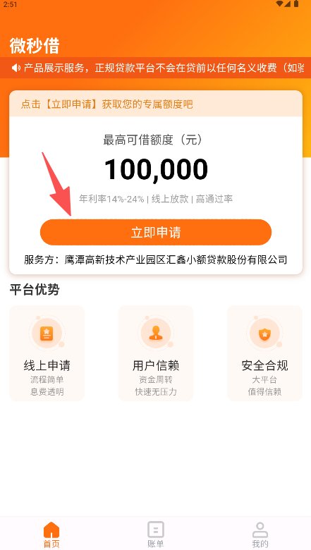 《微秒借》是一款提供贷款服务的软件,最高可借额度100000元,年利率14%-24%,支持线上放款且通过率高。设有立即申请入口,平台优势包括线上申请流程简单息费透明、用户信赖资金周转快速无压力、安全合规大平台值得信赖。还有账单板块可查看借款账单,我的板块可查看个人信息、条款与隐私、安全中心等内容,助力用户便捷申请贷款,清晰管理借款账单与个人账号。