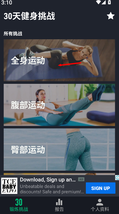 1、进入应用后,点击“全身运动”选项,可查看针对全身肌群设计的训练计划,了解每日锻炼安排与运动目标。