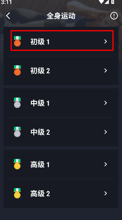 2、在训练页面选择“初级1”课程,适合刚开始锻炼的人群,以基础动作训练为主,帮助建立运动习惯。