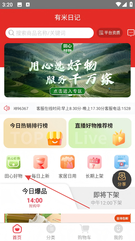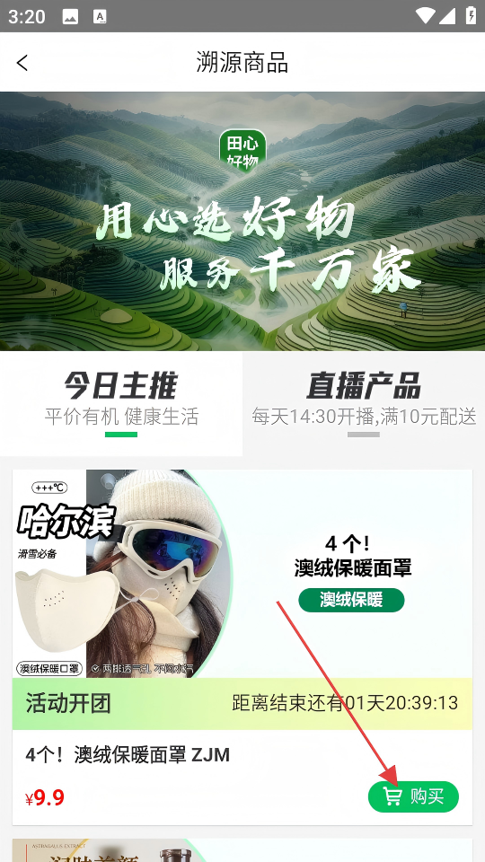 1、在首页点击【田心好物】,进入溯源商品页面。