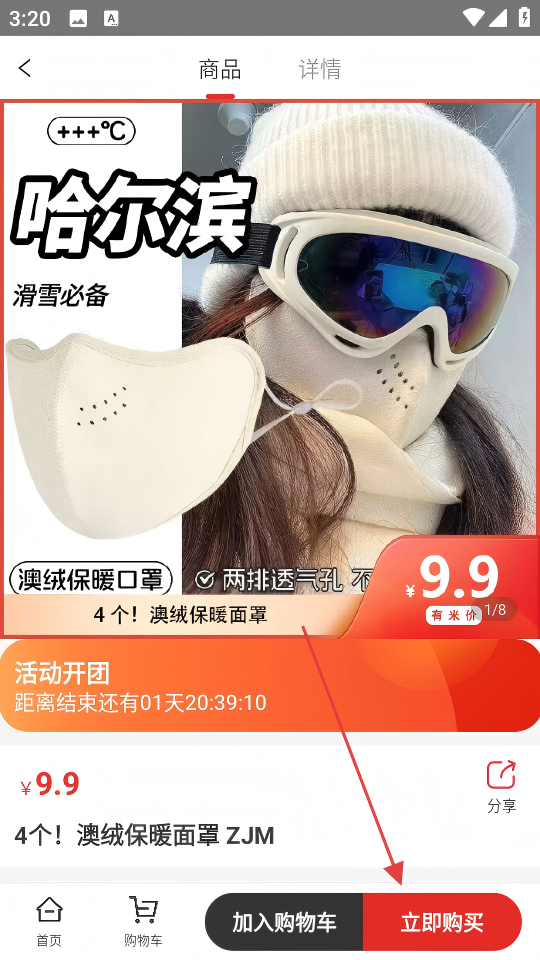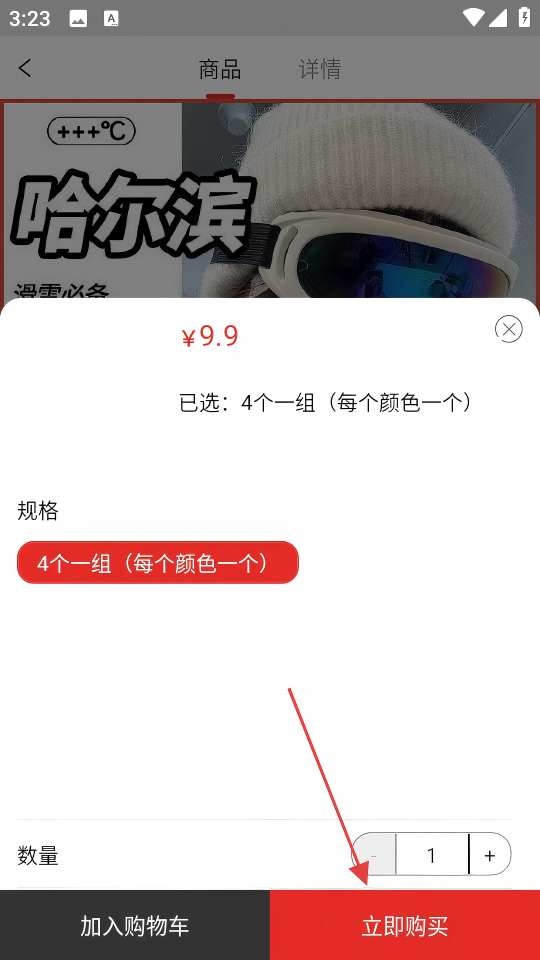 3、在商品详情页面点击【立即购买】,弹出规格选择框。