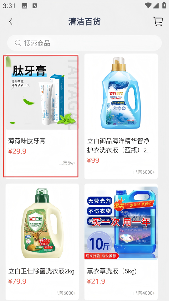 1、在首页点击【清洁百货】,进入清洁百货商品列表页面。