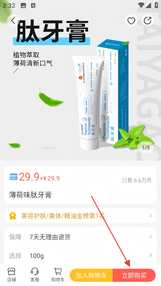 3、在商品详情页面点击【立即购买】,进入确认订单页面。