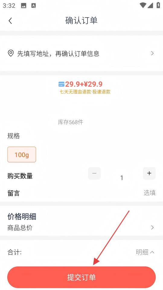 4、在确认订单页面填写收货地址后,点击【提交订单】,完成商品购买流程。