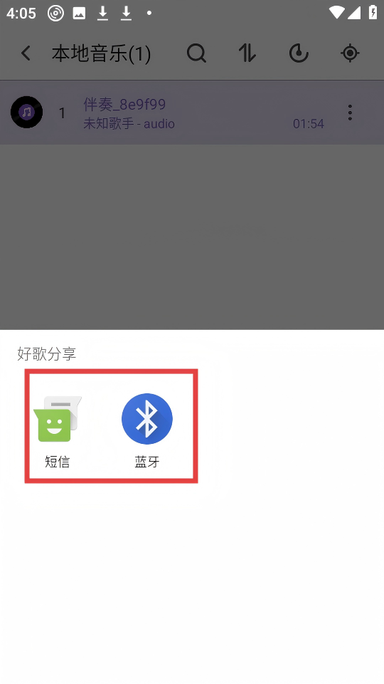 4、选择分享后,可通过【短信】或【蓝牙】方式分享本地音乐。