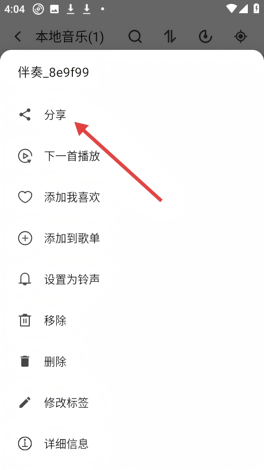3、在本地音乐的操作菜单中,点击【分享】可进行音乐分享操作。