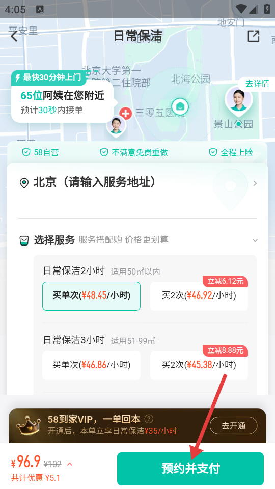 4、在服务详情页面,选择服务时长和购买次数后,点击【预约并支付】按钮完成服务预约操作。