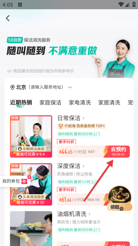 3、在保洁清洗服务页面,选择具体的服务项目,如【日常保洁】,点击【去预约】按钮。