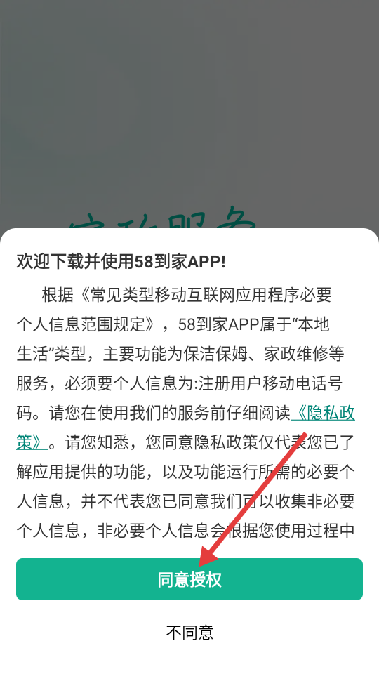 1、在58到家APP的授权页面,点击【同意授权】按钮以继续使用软件。
