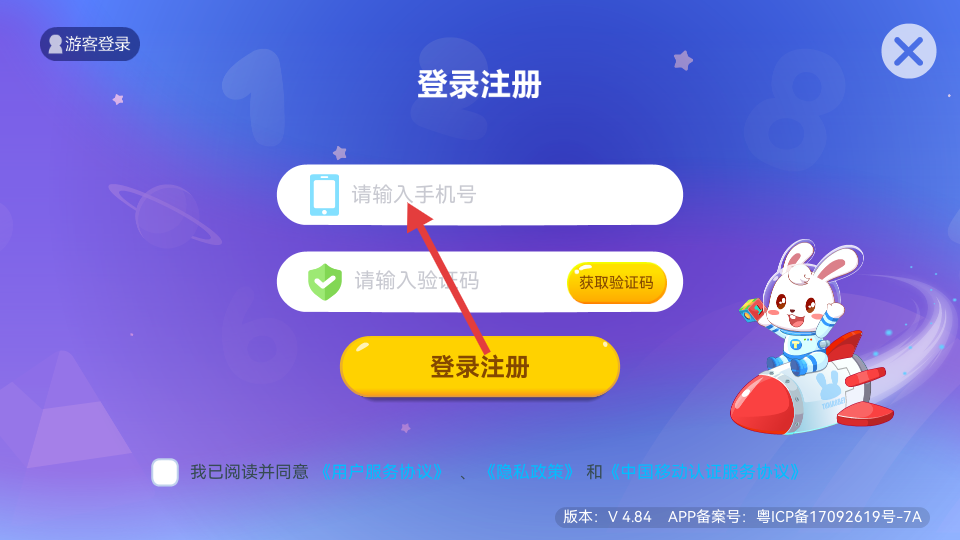 1、在登录注册页面输入手机号和验证码,勾选同意相关协议后点击【登录注册】按钮。