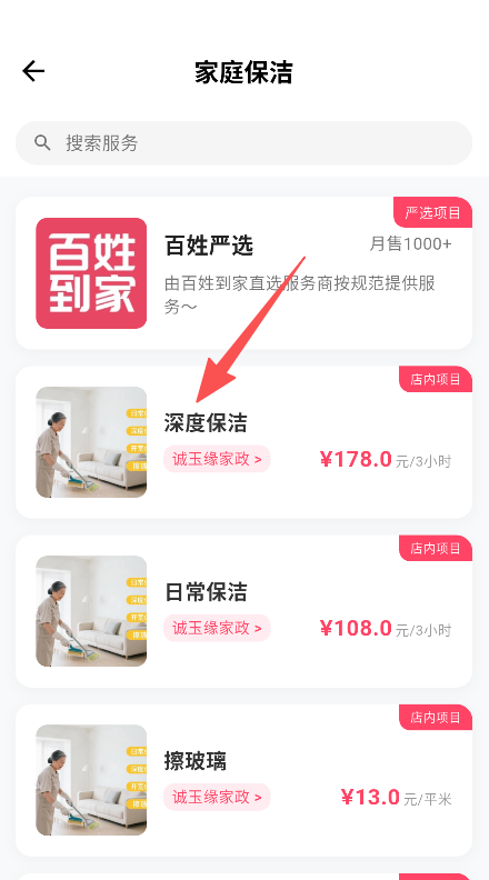 1、服务项目细,仅家庭保洁就有深度保洁、日常保洁、擦玻璃等细分项目,满足不同保洁需求。