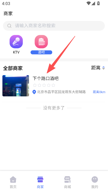 1、打开软件,点击商家,选择酒吧类别查看商家列表。