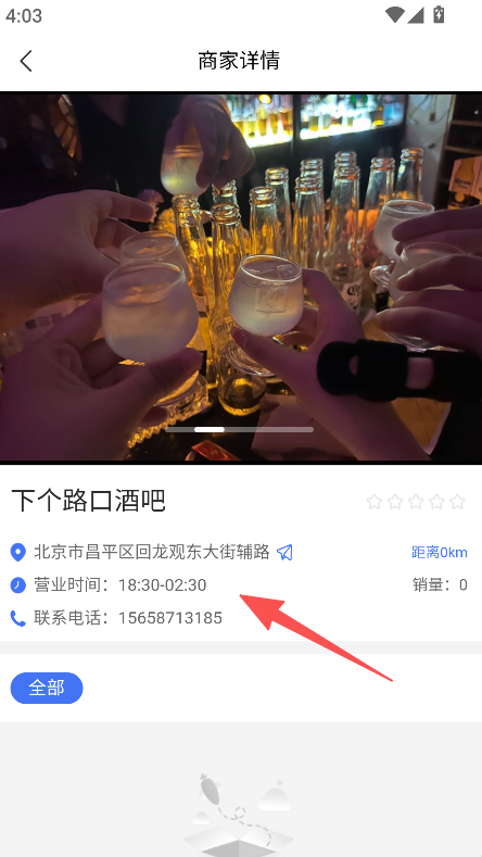 2、点击商家,查看地址、营业时间、联系电话等详情。