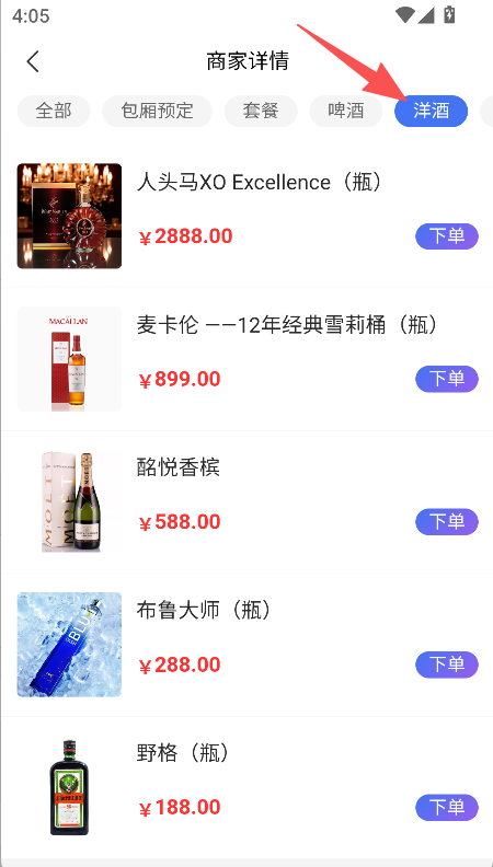 3、在商家详情页,选择洋酒等分类,点击酒水(如人头马XO)旁下单按钮。