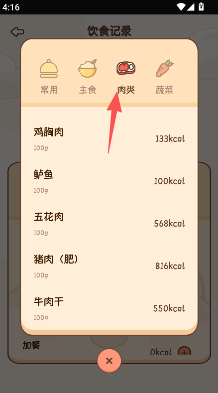 3、在饮食记录中,选择肉类等类别,记录对应食物热量。